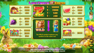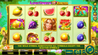 Colourful eggs, blooming daffodils and juicy fruits fill the reels in this cheerful Easter edition of Lady Fruits 10, packed with egg-citing features like Stacked and Scatter symbols, WILD Substitutions and an Expanding Wild. The Lady is the WILD symbol, appearing exclusively on reels 2, 3 and 4. She substitutes for all symbols on the reels except the SCATTER symbols, adding egg-stra sparkle of landing rewarding line hits.